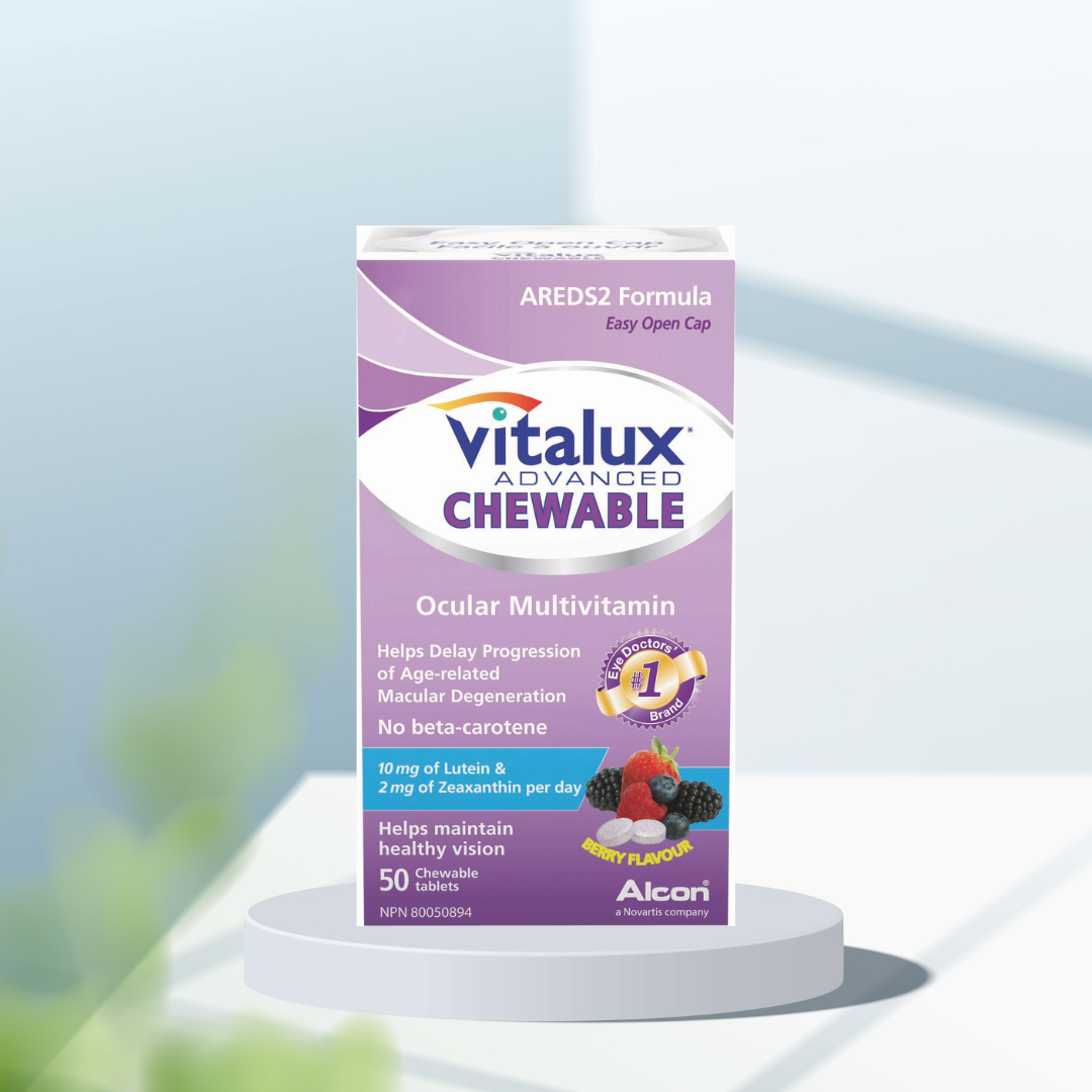 VITALUX® Advanced Chewable Ocular Multivitamin được bào chế một cách khoa học để giúp trì hoãn sự tiến triển của bệnh thoái hóa điểm vàng liên quan đến tuổi tác (AMD) và giúp duy trì thị lực khỏe mạnh. Công thức AREDS2 chứa các loại vitamin phù hợp với liều lượng thích hợp cho bệnh AMD; khẩu phần khuyến nghị hàng ngày (2 viên nhai) chứa 10 mg Lutein, 2 mg Zeaxanthin, Vitamin C & E, Kẽm và Đồng để hỗ trợ đôi mắt khỏe mạnh. Các loại vitamin dạng nhai này có hương vị quả mọng ngon, đơn giản và ngon miệng để giúp duy trì thị lực khỏe mạnh.
