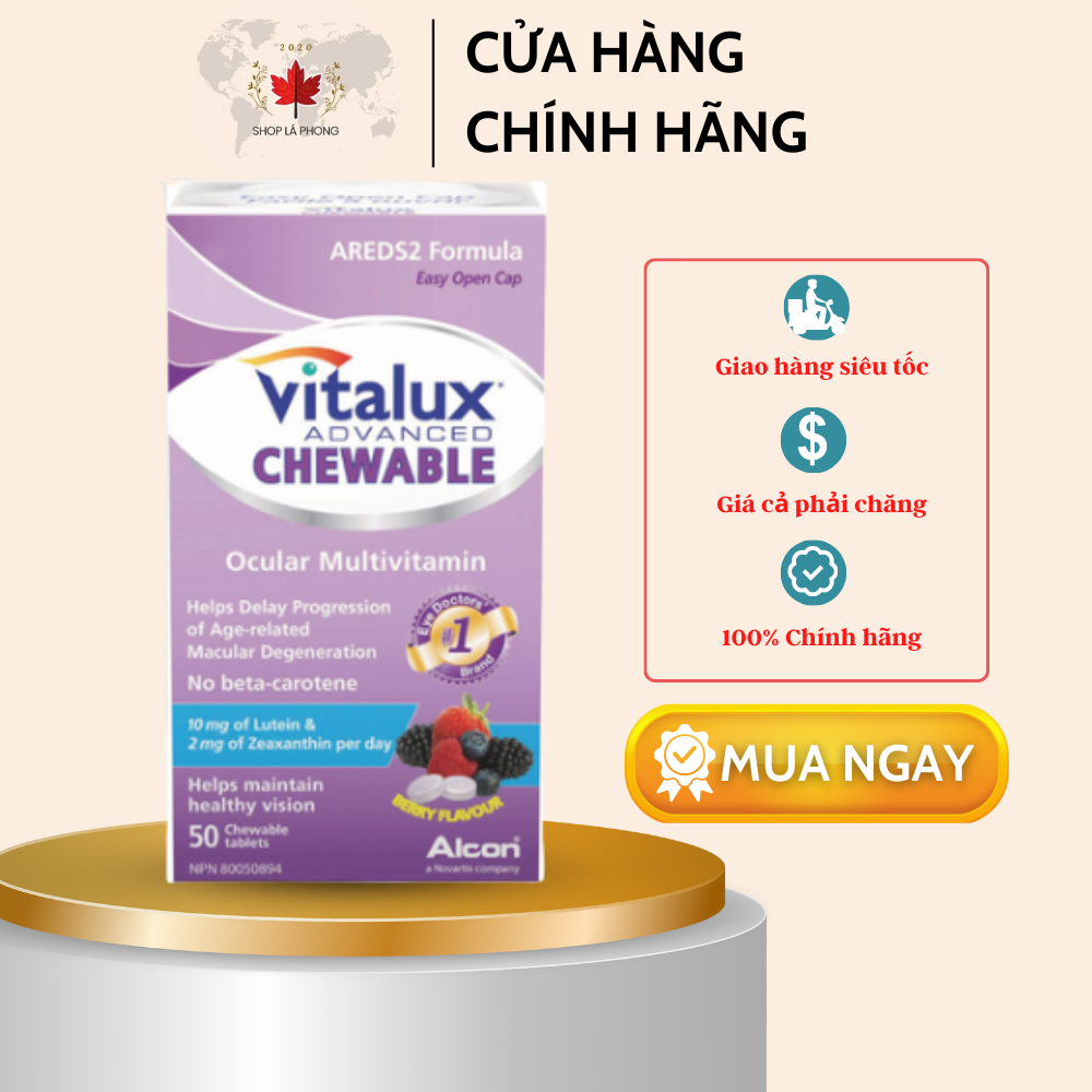 • VITAMIN SỨC KHỎE MẮT: VITALUX® Advanced là một loại vitamin dùng cho mắt nhai được, được bào chế một cách khoa học để giúp trì hoãn sự tiến triển của bệnh thoái hóa điểm vàng liên quan đến tuổi tác (AMD) và duy trì thị lực khỏe mạnh.