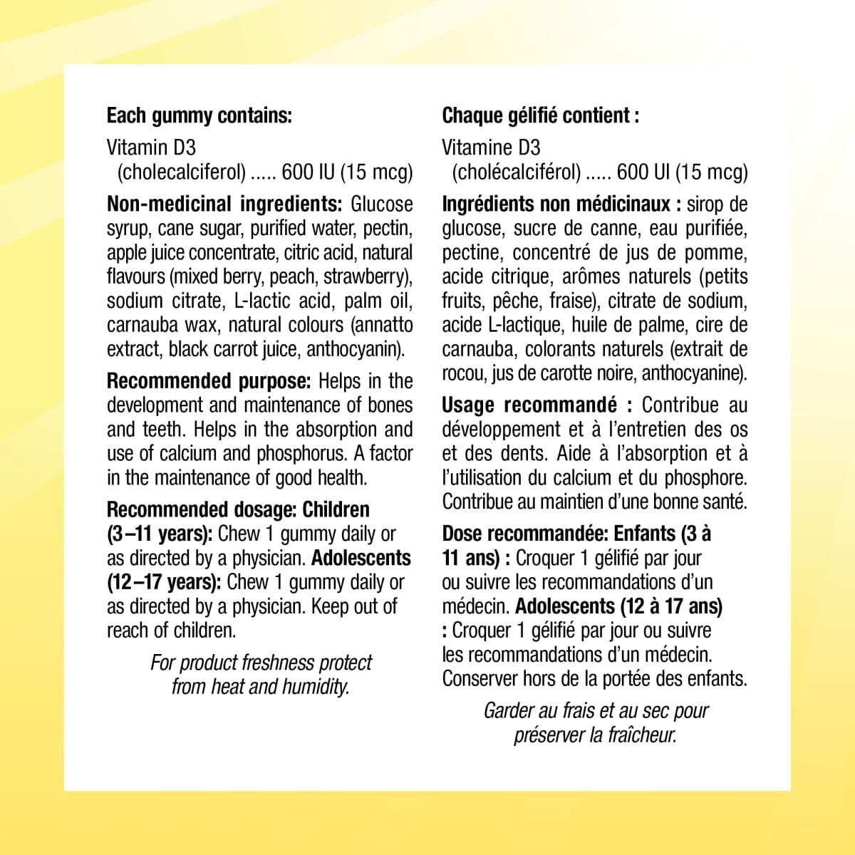 Mỗi viên kẹo dẻo chứa: Vitamin D3 (cholecalciferol) 600 IU (15 mcg) Thành phần không phải là thuốc: Xi-rô glucose, đường mía, nước tinh khiết, pectin, nước ép táo cô đặc, axit xitric, hương vị tự nhiên (hỗn hợp quả mọng, đào, dâu tây) , natri citrate, axit L-lactic, dầu cọ, sáp carnauba, màu tự nhiên (chiết xuất annatto, nước ép cà rốt đen, anthocyanin).