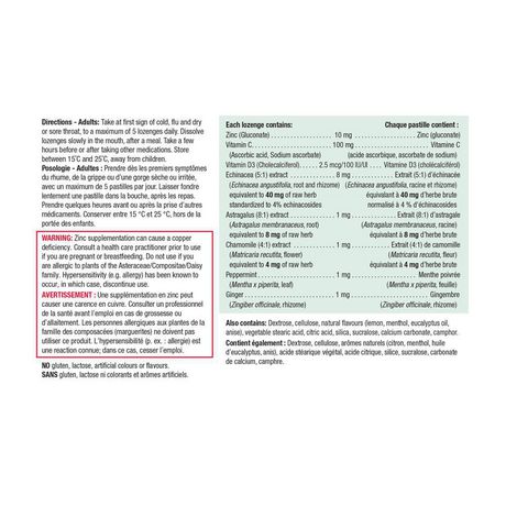 Kẽm (Gluconate) 10 mg Vitamin C (Axit ascorbic, Natri ascorbate) 100 mg Vitamin D3 (Cholecalciferol) 2,5 mcg / 100 IU Chiết xuất cây hoàng thảo (8: 1) (cây Hoàng kỳ, rễ) Tương đương với 8 mg thảo mộc thô 1 mg Cúc La mã (4 : 1) chiết xuất (Matricaria recutita, hoa) Tương đương với 4 mg thảo mộc thô 1 mg Chiết xuất cúc dại (5: 1) (Echinacea angustifolia, rễ và thân rễ) Tương đương với 40 mg thảo mộc thô; Tiêu chuẩn hóa thành 4% Echinacosides 8 mg Gừng (Zingiber officinale, thân rễ) 1 mg Bạc hà (Mentha x piperita, lá) 1 mg Ngoài ra còn chứaDextrose, cellulose, hương vị tự nhiên (chanh, hồi, tinh dầu bạc hà, dầu khuynh diệp), axit stearic thực vật, axit xitric, silica, sucralose, canxi cacbonat, muối camphor.NO (NaCl), gluten, lactose, màu hoặc hương vị nhân tạo.