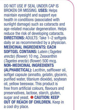 THÀNH PHẦN THUỐC: MỖI PHẦN MỀM CHỨA: Lutein (Tagetes erecta) (hoa) 10 mg, Zeaxanthin (Tagetes erecta) (hoa) 500 mcg. THÀNH PHẦN KHÔNG PHẢI LÀ THUỐC (ALPHABETICAL): Lecithin, dầu cây rum, viên nang mềm (annatto, gelatin, glycerin, nước tinh khiết, titanium dioxide), đậu nành, sáp ong vàng