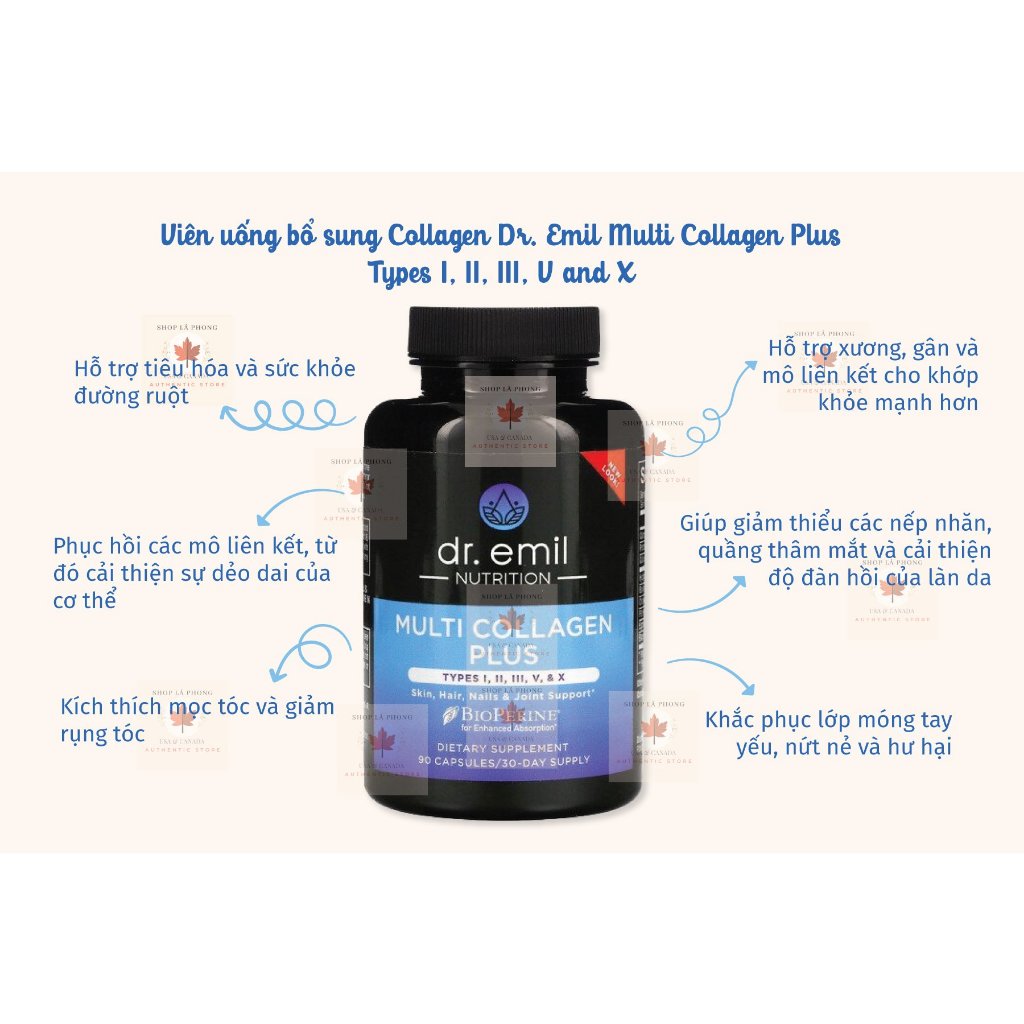 ✅ Viên uống bổ sung Collagen Dr. Emil Multi Collagen Plus Types I, II, III, V, X bao gồm tất cả 5 loại collagen thủy phân để mang lại lợi ích tối đa. Những lợi ích này bao gồm chống lão hóa và giúp tóc, da và móng khỏe mạnh hơn.