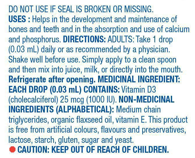 THÀNH PHẦN THUỐC: MỖI LÁ (0,03 mL) CHỨA: Vitamin D3 (cholecalciferol) 25 mcg (1000 IU). THÀNH PHẦN KHÔNG THUỐC (ALPHABETICAL): Chaintriglyceride trung bình, dầu hạt lanh hữu cơ, vitamin E. Sản phẩm này không chứa màu nhân tạo, hương vị và chất dẫn xuất, lactose, tinh bột, gluten, đường và men.